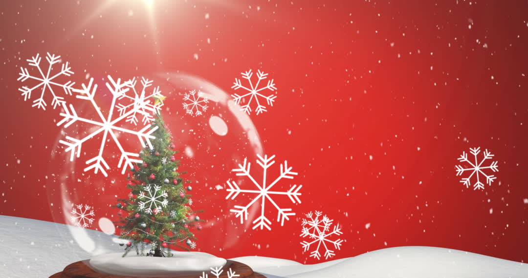 This digital animation features a captivating Christmas snow globe with a beautifully decorated tree inside. Snow is gently falling, enhancing the festive spirit against a vivid red background. This artwork captures the heartwarming essence of the holiday season, perfect for use in holiday greeting cards, festive posters, Christmas advertisements, and digital banners to add a touch of magic and tradition.