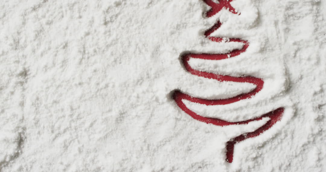 A creative spiral Christmas tree design drawn in powder resembling snow on a vibrant red background, evoking a festive winter atmosphere. Ideal for holiday cards, seasonal advertising, and festive graphic design projects, offering a minimalist yet striking visual for Christmas and winter-themed promotions.