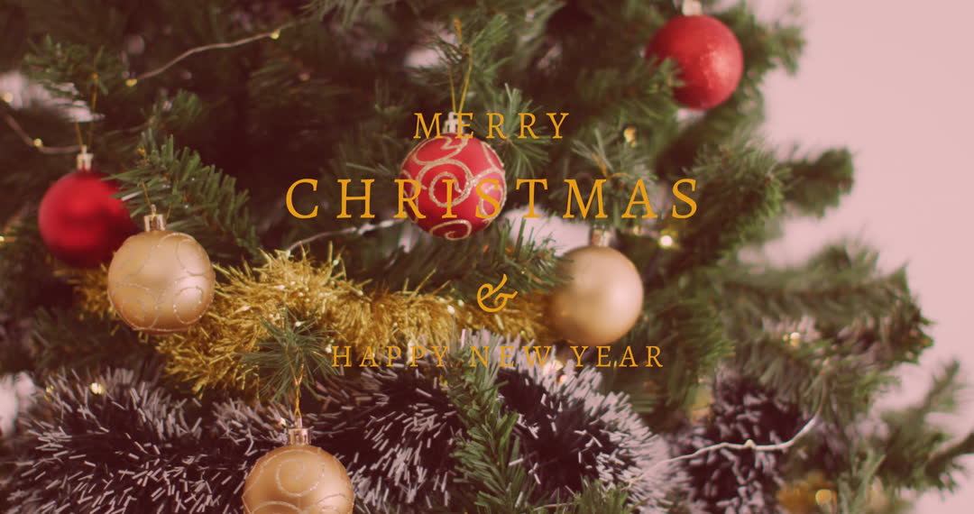 Adorned Christmas tree is greeting viewers with its beautiful ornaments in gold and red, accompanied by merry holiday texts 'Merry Christmas & Happy New Year'. Used for conveying warm wishes for the holiday season on greeting cards, festive banners, or social media posts exemplifying joyous festivities and seasonal cheer.