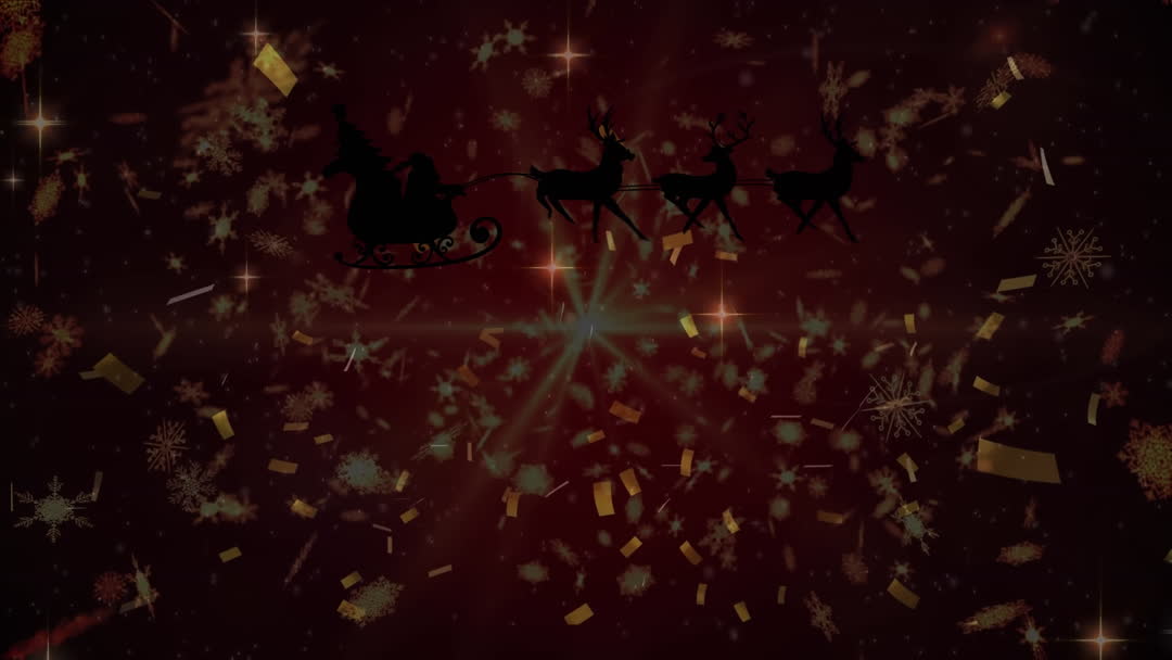 This enchanting scene depicts a silhouette of Santa Claus on his sleigh pulled by reindeer against a dark red background illuminated by sparkling falling stars. This videory creates a warm holiday ambiance, suitable for Christmas-themed greeting cards, festive wrapping paper designs, and seasonal marketing materials to evoke the magic of the holidays.