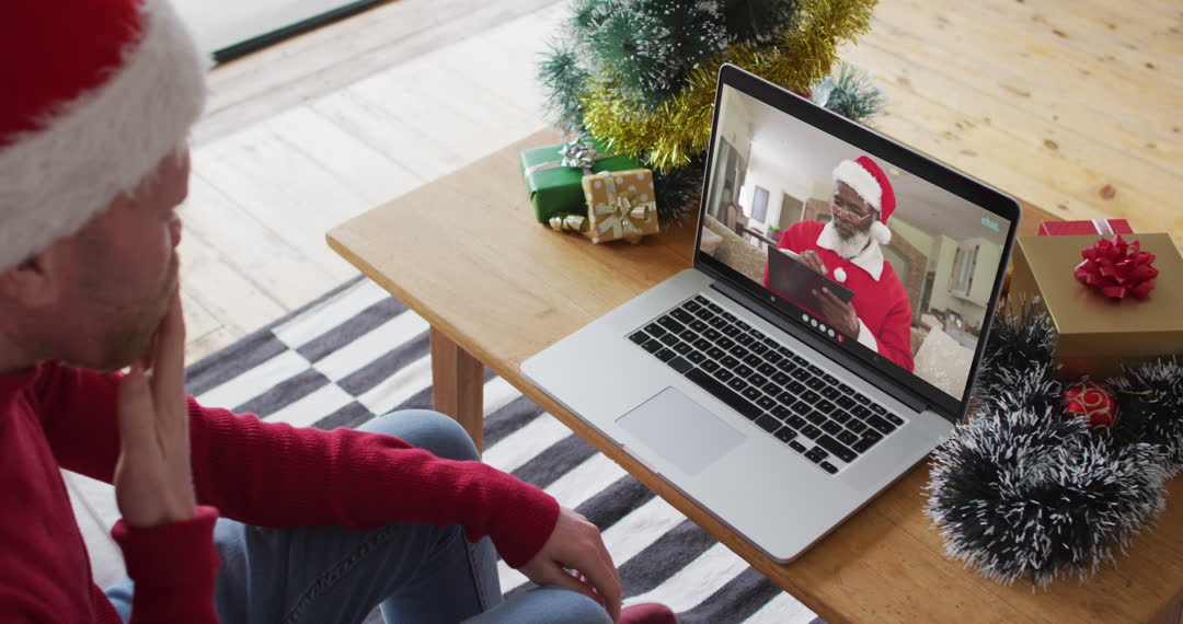 Image depicting two people connecting via a video call on a laptop during the Christmas season. Both wear festive clothing, highlighting connectivity and celebration during the holidays. Useful for illustrating remote communication, modern family connections, and holiday greetings.