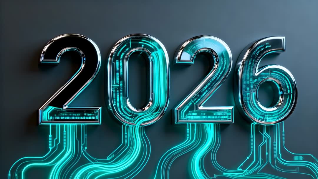 AI Generated Video. Showing chrome 2026 numerals receiving glowing teal circuit traces rising from bottom and flowing into digits. Featuring neon cyan light illuminating matte wall while reflective metal surfaces catch circuitry patterns. Emphasizing contrast between metallic numerals and organic digital lines for high-tech aesthetic. Serving as video clip for New Year tech announcements, product launch teasers, conference openers, website hero headers, social media adverts, broadcast idents. Working well for themes such as AI, blockchain, fintech, electronics, cyberpunk, and modern innovation. Editing suggestions: looping clip for countdown sequences, adding gentle camera pan or zoom, overlaying logo and headline, syncing synth pulse audio for dramatic impact. Delivering versatile asset for commercial projects, corporate presentations, marketing campaigns, and motion design reels.