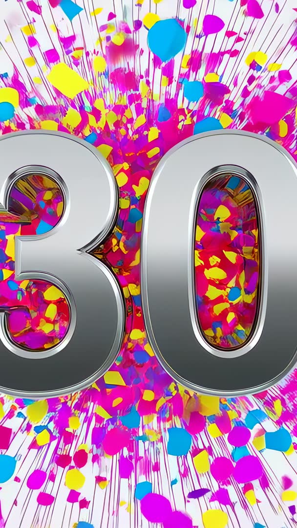 AI Generated Video. Featuring chromed 30 digits with neon confetti bursting outward and colorful streaks on white. Delivering high-energy milestone visuals for 30th birthday, company anniversary, launch celebration, sales promotion. Helping create eye-catching intros and countdowns for Instagram Reels, TikTok, vertical YouTube Shorts, digital signage, event openers. Providing clean central area for overlaying logo, tagline, date, or call-to-action. Suited for event invites, party promos, social campaigns, corporate milestones, retail anniversary campaigns. Offering loop-friendly motion and vibrant color palette for festive marketing and seasonal promotions.