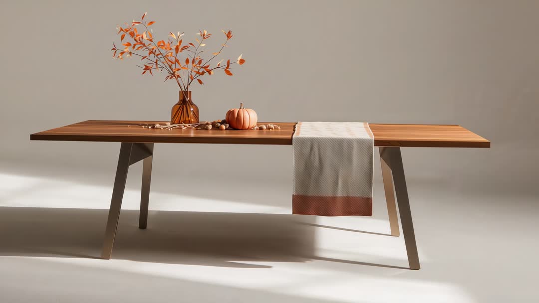 - Cinematic autumn tabletop styling with wooden table, amber vase, pumpkin and soft shadows