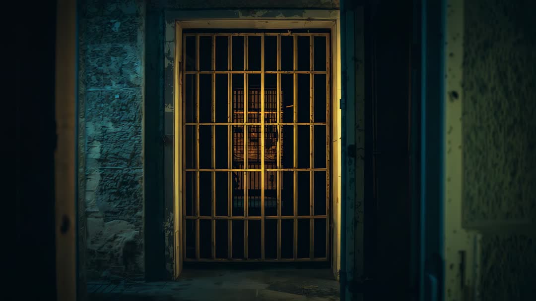 AI Generated Image. Showing camera pushing through rusted metal bars into amber-lit cellblock corridor, creating cinematic sense of depth and confinement. Featuring rough stone frame, heavy barred gate, warm backlight casting long shadows and teal-amber color contrast. Suited for film openers, true crime documentaries, crime drama trailers, thriller promos, haunted attraction marketing, escape room ads, editorial features on incarceration, historical prison tours. Working well as background for headlines, posters, website hero banners, social media reels, and video transitions. Providing mood of tension, isolation, decay and historical grit while leaving room for title overlays and color grading. Delivering cinematic framing and leading lines for storytelling and dramatic reveal sequences.