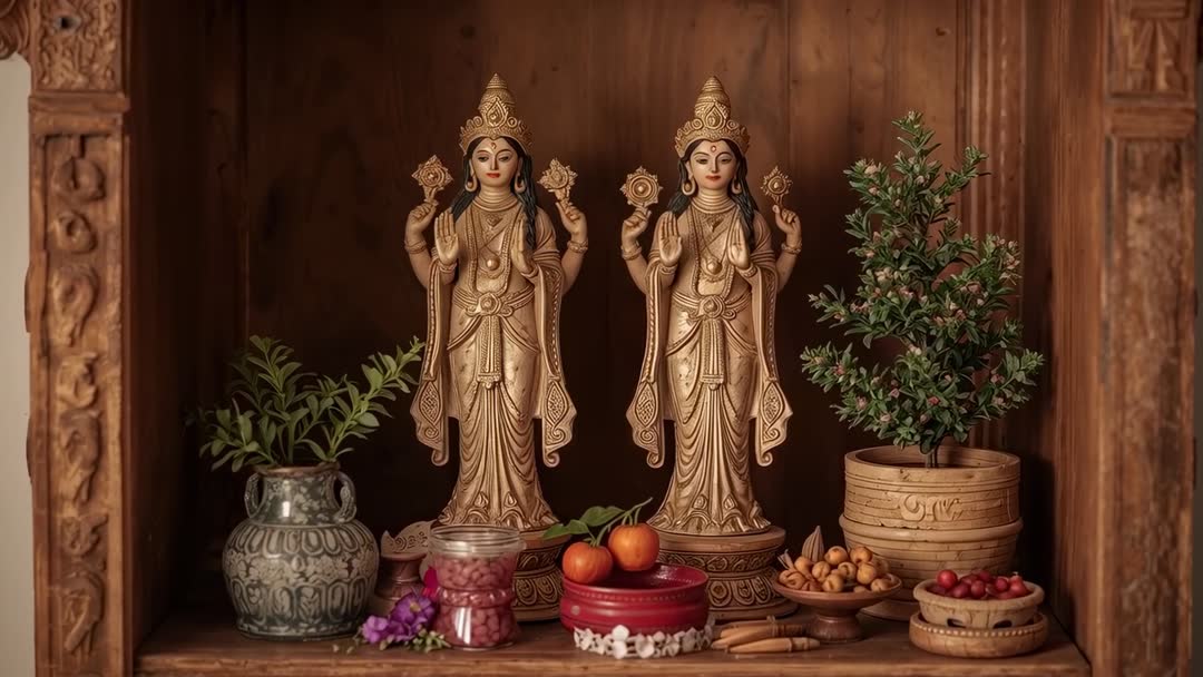 AI Generated Image. Camera pushing in for cinematic close-up of twin golden goddess statues on carved wooden shelf, surrounded by devotional offerings such as bowls of fruit, glass jar with beads, and potted plants. Warm wood tones and soft lighting creating intimate, reverent atmosphere. Composition highlighting ornate statue details and carved shelf, providing clean space for text overlays and slow-motion reveal. Usage ideas: Serving as B-roll for cultural documentaries, supporting religious festival coverage, fueling Diwali promotions, enhancing spiritual or meditation apps, showcasing home decor or artisan craft products, backing online store videos for statues and ritual items, educating viewers about Hindu devotional practices. Also functioning as background clip for interior design reels, lifestyle videos, or travel features exploring temple arts. Technical notes: Delivering medium telephoto feel with shallow depth of field and smooth push-in camera movement for cinematic mood. Color palette centering on warm browns, golds, muted greens, and soft reds, enabling easy color grading and brand integration.