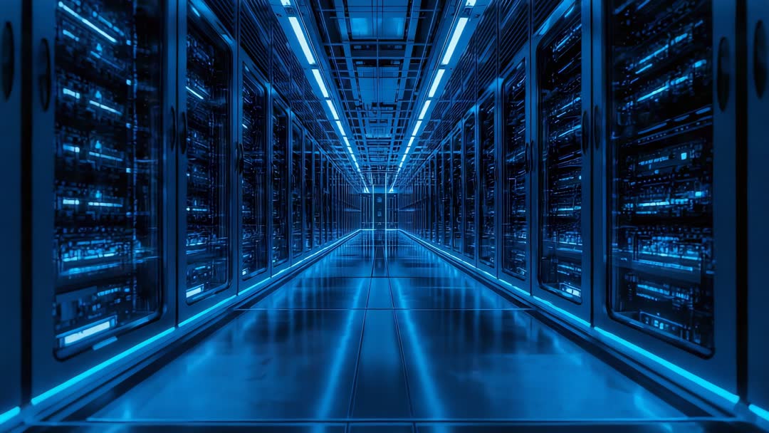 AI Generated Image. Showing central aisle of high-density server racks bathed in cool blue LED light. Featuring symmetrical rack cabinets with glowing status LEDs reflecting on glossy raised floor and ceiling-mounted cable trays. Camera moving forward along aisle while capturing ambient reflections and equipment details, creating cinematic perspective ideal for tech, cloud, AI, cybersecurity storytelling. Useful for corporate video backgrounds, website hero headers, data center tour clips, promotional spots for cloud services, IT infrastructure training, investor presentations, broadcast segments on digital transformation. Serving as loopable background for motion graphics, title stings, lower thirds, product demo overlays. Highlighting themes of connectivity, uptime, scalability, high-performance computing. Providing footage with strong leading lines, deep perspective, cool-toned color palette for modern high-tech branding.