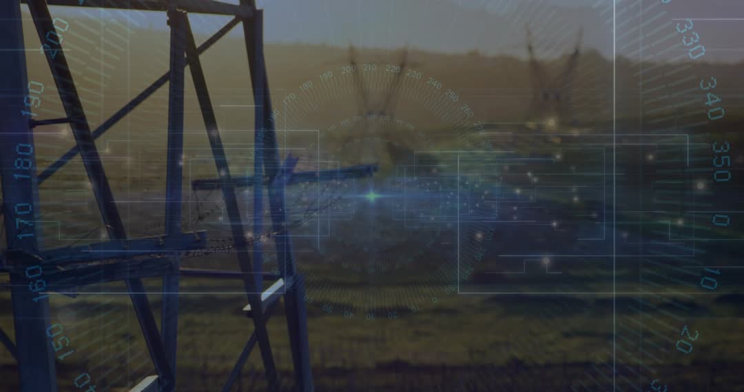 Clip showing lateral camera shift across rural landscape at sunrise, with left lattice transmission tower rising into frame. Digital HUD overlay drifting across screen while particle grid mapping and data points glowing. Atmospheric light and shallow depth creating cinematic mood and subtle lens flare. Visual narrative blending energy infrastructure and digital monitoring, emphasizing drone inspection and smart grid telemetry. Use for energy sector promo, technology corporate opener, infrastructure documentary, drone services marketing, broadcast title background, training video for inspection workflows, UX demo for AR/IoT platforms. Providing ample negative space for lower third text and logo placement, and clean composition for color grading and VFX compositing. Suitable for HD and 4K timelines, looping background, and cinematic transitions.