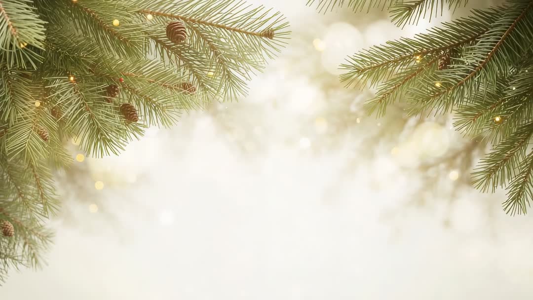 AI Generated Video. Featuring close-up evergreen fir branches and pinecones framing soft pale bokeh background with warm golden lights twinkling among needles. Creating cozy festive mood and natural vignette suitable for overlaying text, logos, countdowns, or product shots. Serving as holiday greeting video background, social media reel, website header, or seasonal ad banner. Enhancing seasonal marketing, event invitations, slideshows, and store display videos. Providing loopable motion for continuous background use and easy color grading for brand matching.