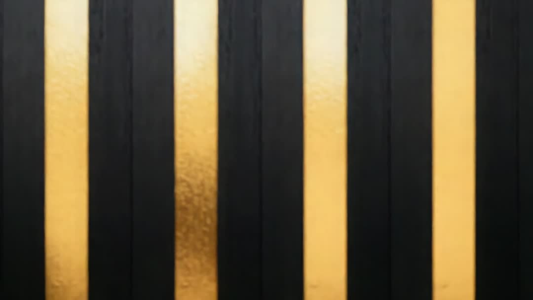 AI Generated Image. Featuring vertical gold strips glinting against matte black slats, footage conveying luxe minimalism and rhythmic repetition. Tight framing and high-contrast metallic highlights creating dramatic vertical pattern and subtle patina texture. Slow camera movement or hold-frame options making clip suitable for cinematic intros, title sequences, product reveal animations. Lighting reflections providing elegant shimmer useful for fashion, jewelry, cosmetics, luxury brand campaigns. Neutral composition and balanced symmetry supporting overlaying text, logos, lower thirds for broadcast and social media. Ideal for website hero backgrounds, event promo reels, stage design presentations, interior decor mood boards, motion graphics projects. Clip available as loopable plate for extended backgrounds and transitions. AI-generated visual source noted for creative use.