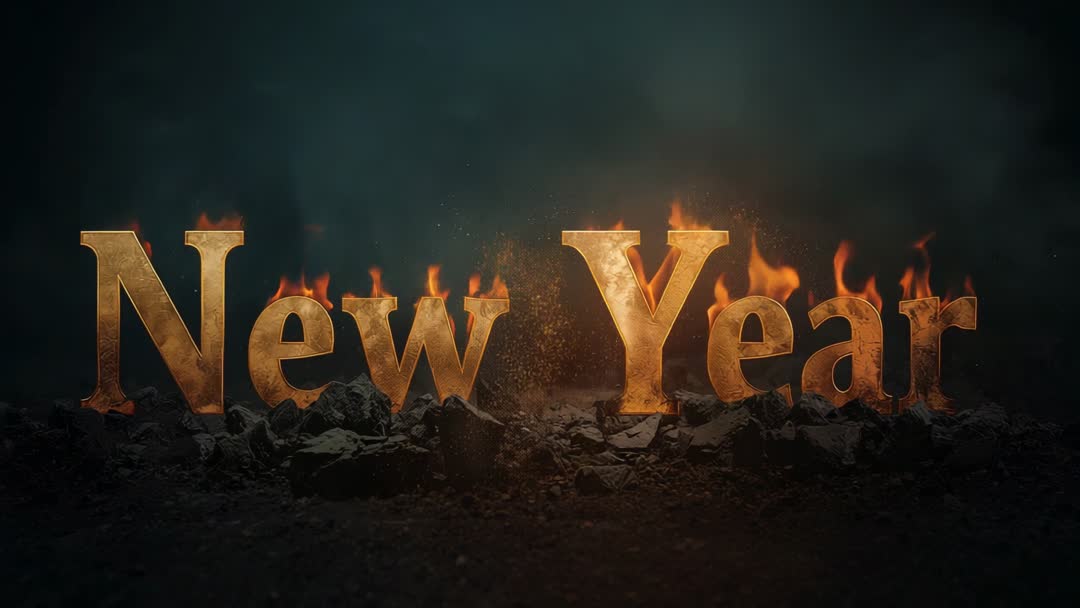 AI Generated Image. Video showing glowing golden New Year typography burning with flames behind letters on dark rocky ground, delivering cinematic and moody atmosphere. Cinematic camera moving with slow push and subtle shake, slow motion sparks and ember particles accentuating molten metal texture and rugged foreground. High-contrast moody lighting and studio-grade VFX creating dramatic reveal, suiting broadcast openers, event trailers, and countdown sequences. Usage ideas including New Year countdowns, holiday party promos, social media reels, website hero banners, digital greeting cards, promotional ads, cinematic title sequences and festival trailers. Providing post-production tips suggesting deep teal backdrop, warm orange highlights, heavy contrast grade, adding rumbling bass and ascending synth for epic reveal. Providing variations such as looping short clip for social ads, extended slow reveal for TV openers, transparent alpha pass for layered compositing.