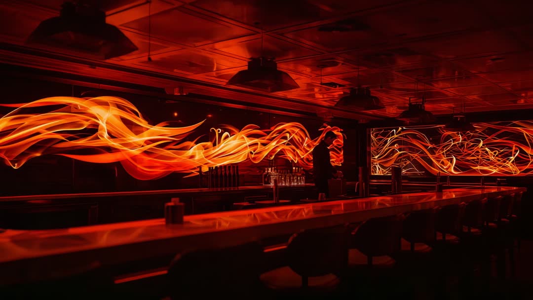 AI Generated Image. Video showing LED ribbon light sweeping across glossy bar counter while bartender silhouette moving behind bar, creating vivid red-orange streaks and mirrored reflections. Footage capturing dynamic motion and moody ambient glow, evoking late-night energy and intimate club vibe. Suiting nightclub promo, enhancing cocktail menu motion background, working as website hero banner, boosting social media ad performance, serving as event opener, and complementing DJ visuals or VJ loops. Color grading recommending warm red-orange palette, increasing contrast and adding subtle motion blur for cinematic feel. Text placement working well on left side near counter for headline and on right side for logo or call to action. Providing loopable footage, offering high-contrast low-light mood, fitting background video or overlay use for hospitality, entertainment, lifestyle, and design projects.