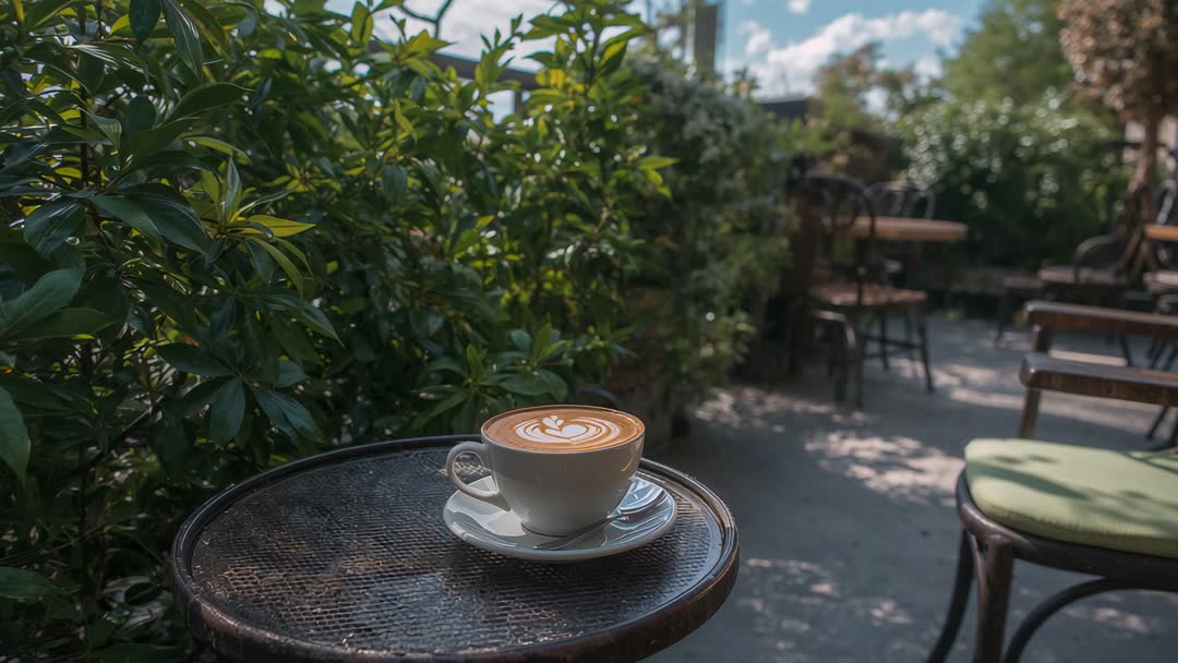 AI Generated Image. Video clip showing slow panning across latte cup with heart latte art resting on metal mesh bistro table, framing hedge-lined patio and dappled sunlight. Scene conveying peaceful morning ritual and urban garden cafe vibe with warm tones and shallow depth of field. Ideal for cafe promotional video, coffee brand commercial, social media reel, website hero banner, lifestyle vlog opener, background loop for waiting area screens. Editors cropping to 16:9, 4:5, 9:16, grading color for warmer mood, adding ambient cafe sound or soft music. Pairing well with text overlays for menu highlights, blog posts about coffee culture, mindfulness and slow living content, travel guides, hospitality marketing, product packaging mockups.