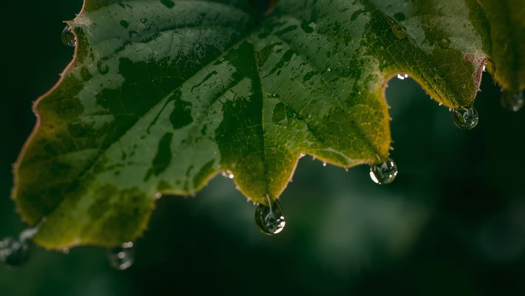 AI Generated Image. Video showing cinematic slow-motion of water droplets forming along serrated green leaf edge and falling into soft bokeh background. Macro framing highlighting leaf veins, surface texture, and droplets merging by surface tension. Clip keeping moody green tones and high contrast for dramatic, tranquil mood. Ideal for use as loopable background in nature documentaries, environment and conservation campaigns, gardening and horticulture content, spa and wellness promotions, meditation and mindfulness apps, weather and science education segments. Suitable for website hero headers, social media reels (9:16 vertical crop), Instagram posts (1:1), broadcast spots (16:9), and retail display loops. Recommend color grading to enhance greens and highlights, adding subtle film grain for cinematic feel. Recommend using overlays and text callouts for promotional messaging or pairing with soft ambient audio for calming visual content.