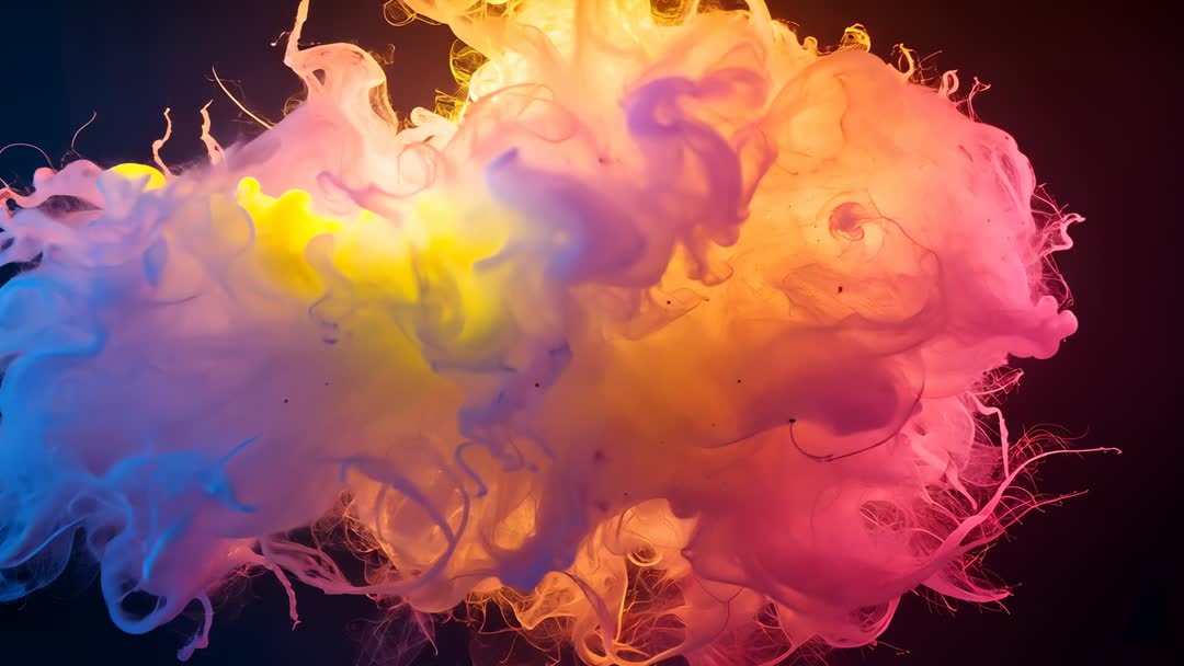 AI Generated Image. Video showing slow-motion injection of colored ink into dark water tank, forming multicolor plume that is swelling and curling into cloudlike shapes. Studio side lighting highlighting delicate filaments and vibrant gradients of blue, yellow, pink and orange while fluid diffusion and pigment interaction are creating soft edges and high-contrast details. Footage capturing high-frame-rate motion for smooth slow-motion playback and easy trimming for loopable loops or loopable background segments. Ideal for using as dynamic background for music videos, title sequences, promotional ads, website hero banners, and social media posts; enhancing product packaging mockups, editorial spreads, album art, and gallery projections; supporting tutorials on fluid dynamics, paint experiments, and visual effects compositing. Offering clean dark negative space for overlaying text, logos, or lower-third graphics while retaining dramatic color and organic motion for creative branding and motion design projects.