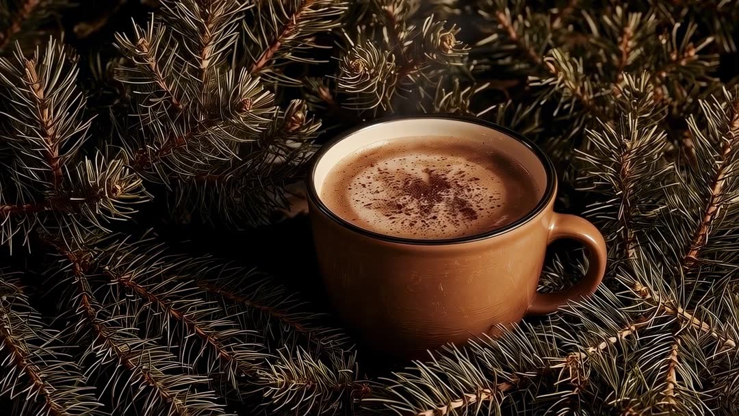 AI Generated Video. Camera starting slow tightening frame around brown ceramic mug, focusing on rim detail, froth texture, and cocoa dusting. Evergreen fir twigs surrounding mug, creating warm rustic composition with shallow depth of field and soft highlights. Warm low-key lighting enhancing rich brown tones and foam contrast, producing cozy intimate mood for winter and holiday content. Footage working well for beverage branding, coffee shop promos, seasonal social media reels, product hero clips, b-roll for culinary videos, and background for website banners. Recommending cropping to 16:9 for web, adding slow ramp-in for cinematic reveal, applying gentle color grade boosting warmth, and creating seamless loop for ambient background. High-resolution frame from video supporting editorial and commercial licensing, offering close-up detail for macro texture shots and product packaging use.