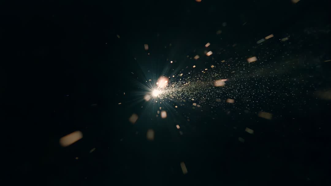 AI Generated Image. Short cinematic video clip showing bright core emitting shimmering sparks, glowing dust motes, and bokeh flecks across dark cosmic void, suggesting comet trail or energy discharge. Featuring cool teal highlights and warm golden sparks, creating moody, cinematic atmosphere and strong sense of motion. Useful for title intros, logo reveals, sci?fi sequences, music visuals, tech product promos, background loops, and VFX overlays. Working well as transitional element or layered compositing plate for motion graphics and film projects. Suggesting color grading and glow enhancements to increase depth and match project palette.