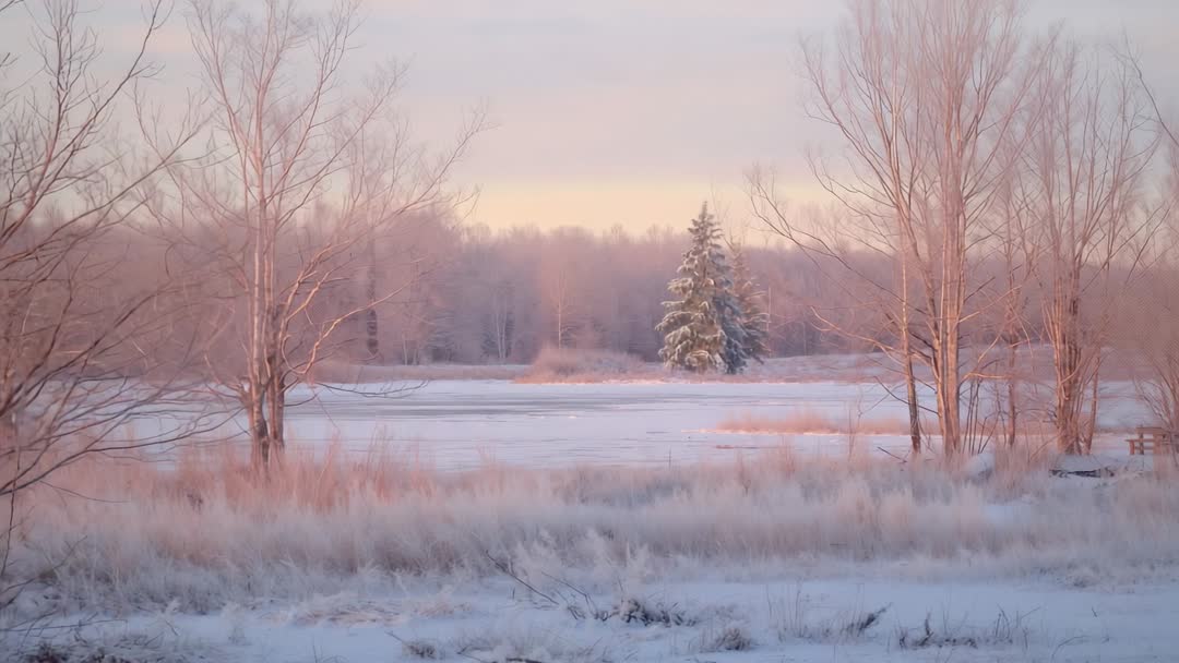 AI Generated Video. Footage showing gentle dawn light bathing frosted meadow and lone evergreen, creating pastel pink and gold color palette. Composition featuring centered evergreen framed by slender birch trunks, foreground frosted grasses, midground frozen pond and distant tree line. Clip working well for website banners, social media headers, holiday and seasonal campaigns, nature documentaries, meditation and wellness apps, travel and tourism promos, calendar spreads and print layouts. Text overlay space available in upper sky area for titles and logos. Slow pan or crossfade transitions enhancing calming mood for cinematic openers and ambient background loops. Color grading suggestion: enhance warm highlights and soft mauve tones for dreamy winter mood.