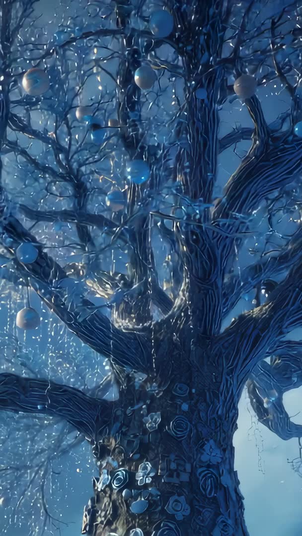 AI Generated Image. Providing cinematic vertical footage showing ornate sculpted tree tilting upward through tangled branches dotted with reflective glass and metallic ornaments, while droplets cascading and catching twilight highlights. Creating moody, elegant atmosphere through cool blue palette and gentle sparkle, suiting fantasy, luxury, or seasonal narratives. Serving as cinematic opener, music video interlude, fashion or fragrance spot, seasonal campaign hero, or meditation app background. Pairing well with slow ambient soundtrack, subtle text overlays, or parallax motion for immersive storytelling. Optimizing for social vertical formats, fullscreen mobile reels, digital signage, or gallery projection.