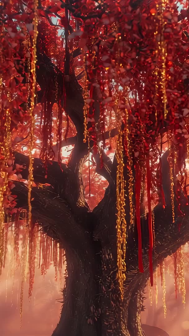 - Cinematic vertical footage moving into glowing red enchanted tree with hanging golden vines