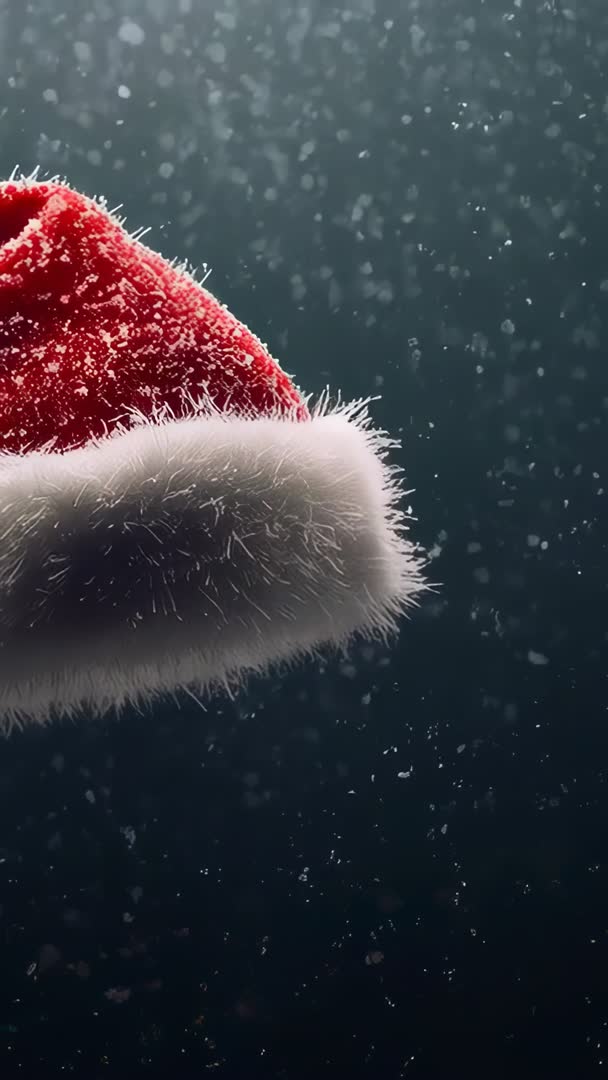 AI Generated Video. Showing close-up cinematic pan across frost-dusted red velvet Santa hat with fluffy white fur trim and falling snow against dark bokeh background. Capturing rich texture, velvet fibers, frosty crystals and moody lighting to emphasize tactile detail. Ideal for holiday commercial intros, seasonal social media reels, Christmas ad banners, greeting card animations, retail promotions and in-store displays. Working well as vertical hero footage for Instagram Reels, TikTok ads, Stories and mobile landing pages. Allowing easy overlay of text on negative space at right for branding or call-to-action. Offering slow motion option to highlight falling snow and texture details. Including clean studio lighting for color grading and compositing into festive campaigns.