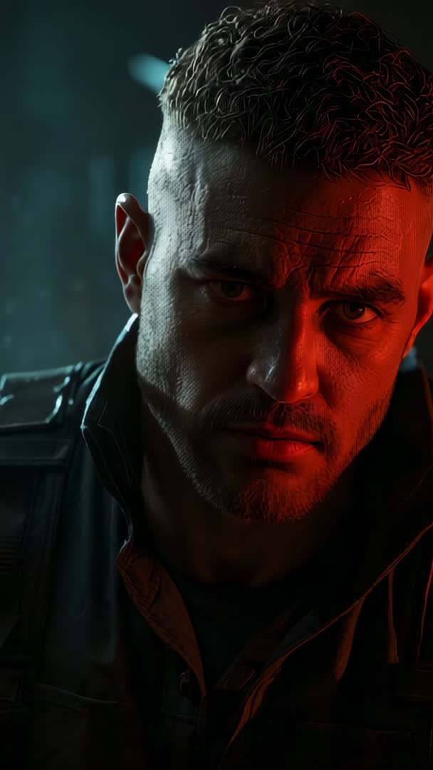 AI Generated Image. Clip showing tactical man tensing then softening expression during closeup in dim industrial bay. Lighting combining red rim and teal fill creating cinematic contrast and deep shadows. Footage working well for film trailer, character reveal, action game cinematic, behind-the-scenes promo, actor reel, social media vertical ad. Editing suggestions: apply slow push-in, add low ambient rumble and distant machinery sounds, color grade teal and orange, add subtle film grain and smoke, loop short 6-12 second segment for vertical stories. Emotionally focused performance helping convey tension, resolve, inner conflict for storytelling and marketing projects.