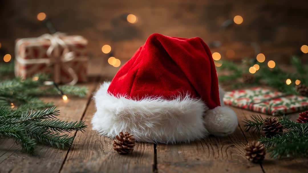 AI Generated Video. Shifting focus and zooming to reveal red Santa hat resting on rustic wooden table, background bokeh lights twinkling and evergreen branches framing scene. Pinecones and gift wrapped in kraft paper with twine adding handcrafted, seasonal detail. Velvet hat texture and fluffy white trim offering tactile contrast against rough wood grain, shallow depth of field creating cinematic, intimate mood. Clip working well for holiday marketing, social media reels, e-commerce product pages, greeting video openers, and seasonal event promos. Use as hero footage for gift guide banners, menu overlays in restaurant holiday campaigns, or background loop behind festive text. Recommend pairing with soft piano or acoustic guitar, slow pan or gentle zoom for smooth loop. Color palette featuring warm amber lights, deep red, natural greens, and muted browns supporting cozy, nostalgic brand messaging. Crop to widescreen or square for platform-specific layouts, reserve upper or lower thirds for text overlays and branding. Include optional motion graphics such as falling snow or animated twinkle to enhance festive atmosphere.