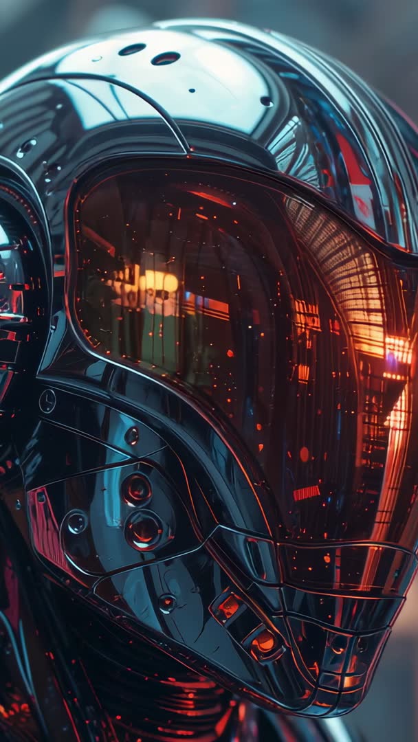 AI Generated Image. Video starting with camera circling metallic helmet on stand in lab, visor pulsing warm orange glow and surfaces reflecting ambient light. Shot using shallow depth of field, cinematic vertical framing, slow-motion micro details, close-up pans across panels and fastened rivets. Mood combining sleek futurism and subtle menace, with high-contrast reflections and neon highlights. Ideal for tech promo, sci-fi trailer, product demo, concept design showcase, motion background for presentations, vertical social reels, app intros and VFX portfolios. Post production tips: color grading leaning toward cool blue with warm orange highlights to emphasize visor glow; adding bloom and subtle film grain for tactile feel; using slow-ease speed ramps for dramatic reveal. Sound design tips: adding ambient synth pads, sparse mechanical clicks, low-frequency rumble and distant arpeggios for tension. Licensing note: vertical format optimized for mobile and social platforms; using looping cuts for hero banners, intro sequences or background visuals.