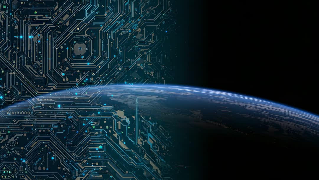 AI Generated Image. Showing digital circuit board overlay merging with Earth limb from orbit, blue nodes pulsing along intricate traces and microchip patterns. Featuring high-contrast composition with deep space black and neon blue highlights, conveying futuristic global connectivity and flowing data. Serving tech companies, AI startups, satellite operators, cybersecurity firms, cloud providers, fintech brands for use in website hero clips, product launch videos, conference openers, explainer animations, and promotional banners. Enhancing branding with animated overlays, motion graphics, keynote slide backgrounds, and social media ad creative. Offering cinematic pace and abstract tech aesthetic, suitable for editorial pieces and presentations about AI, IoT, digital transformation, space technology, and global communications.