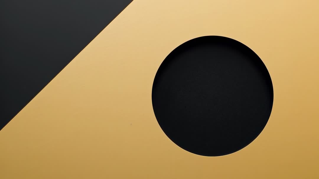 AI Generated Image. Minimal abstract motion video featuring circular aperture sliding across metallic gold plane and revealing deep black void. Strong diagonal composition and high contrast between warm gold and matte black creating elegant modern look. Providing versatile loopable background for luxury brand intros, product reveals, title sequences, web hero headers, social media ads, and corporate presentations. Working well for packaging mockups, motion graphics overlays, print layout, editorial spreads, and architectural visualizations. Offering generous negative space for overlaying logo, tagline, or lower-third graphics. Delivering cinematic studio lighting, refined texture, and clear focal point for high-end commercial use.