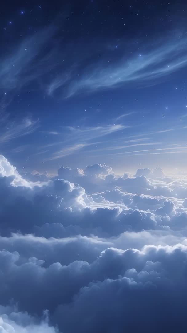 AI Generated Image. Video capturing cirrus streaks drifting across high sky while cumulus clouds shifting below, stars twinkling and horizon glowing with soft light. Vertical composition highlighting depth and motion, offering immersive sense of altitude and calm. Suiting mobile app backgrounds, social media reels, vertical ads, meditation and sleep apps, airline and travel promos, cinematic title sequences, nature and wellness projects. Easy to loop, slow down, or color-grade to match mood. Use for calming transitions, ambient visuals, website hero banners, or stock footage libraries seeking serene celestial atmosphere.