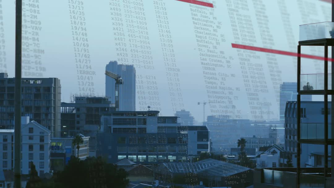 City skyline analytics showing spreadsheet overlay and sliding red bars visualizing urban data Video