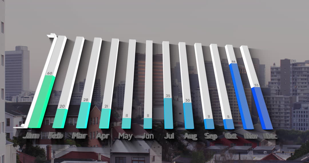 Motion graphic showcasing an urban skyline with dynamic 3D graphs illustrating monthly statistical changes. Ideal for corporate presentations, market analysis seminars, or digital workspace backgrounds where showcasing data and growth trends is essential.