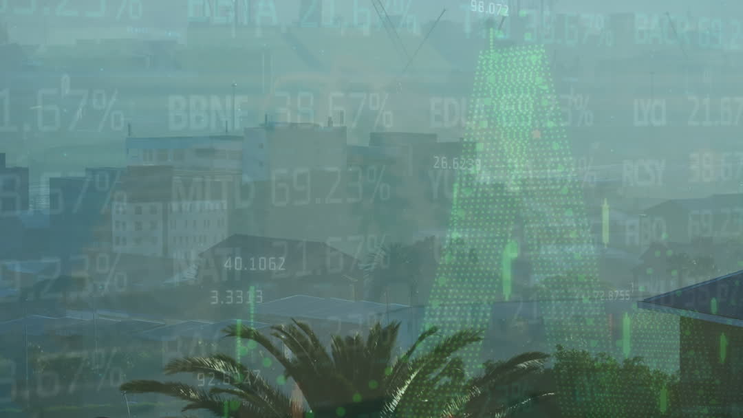 City scene combined with animated stock market data provides a dynamic representation of modern business activities. The integration suggests a connection between urban life and global financial movements. Ideal for illustrating topics related to business trends, economic growth, and technological advancement in an urban setting. Useful in financial presentations, investment reports, and promotional material for finance-related content.