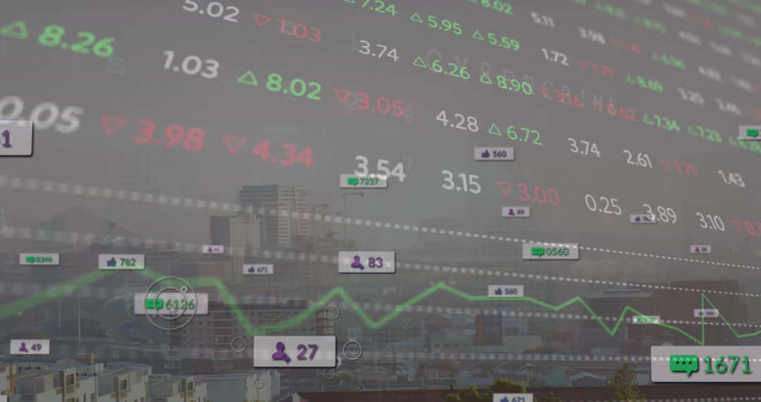 This visualization combines a cityscape with animated financial data, highlighting real-time stock market analysis superimposed on an urban backdrop. The videory is ideal for depicting complex financial processes or reporting on economic developments in metropolitan areas. Potential uses include financial news broadcasts, business presentations, or investment strategy materials.