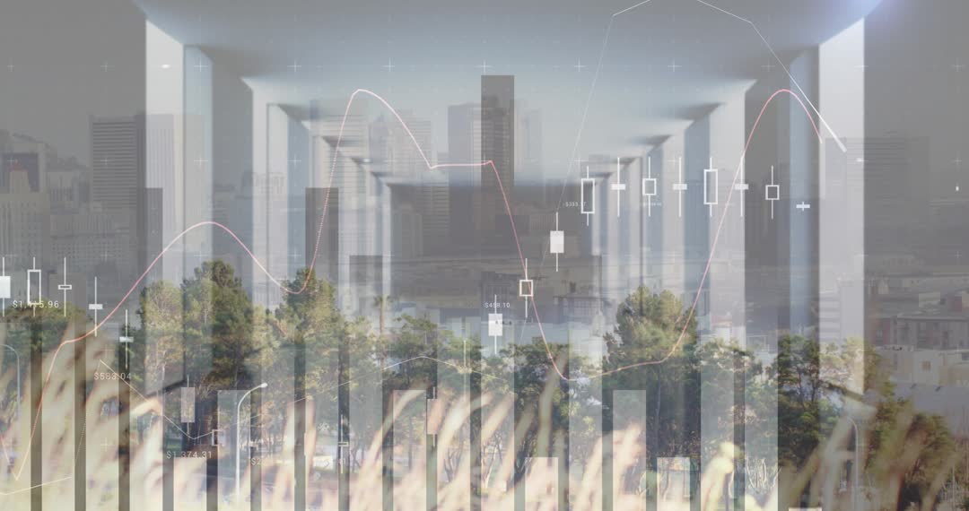 This scene depicts a modern city skyline overlaid with visualized financial market data including line graphs, candlestick charts, and trending flows. Created for presentations on market trends, technological impact on finance, or NGO studies focusing on analytics in urban environments, making it a versatile choice for educational materials, conferences on digital finance, or economic impact studies.