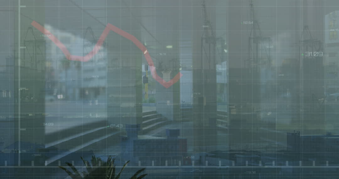 Graphic overlay of falling financial trend lines on a busy city backdrop. Perfect for use in financial presentations, illustrating impacts on global business, or showcasing economic challenges through digital interfaces.