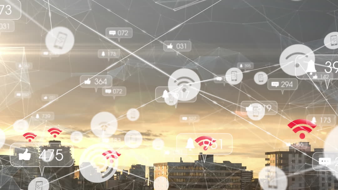 Cityscape with Social Media Icon Overlays Representing Global Connectivity Video