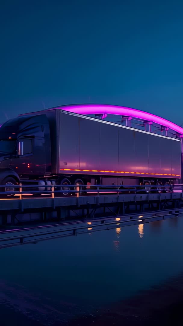 AI Generated Image. Entering frame from left, Class 8 truck traveling across magenta-lit arch bridge at dusk, LED side lights and headlights reflecting on calm water below. Vertical 9:16 composition offering cinematic mobile-first perspective, ideal for social media stories, mobile ads, and fullscreen website banners. Motion-friendly framing allowing smooth looping, slow-motion cuts, and safe space for text and logo overlays. Use for transport and logistics branding, freight company promos, electric truck launches, urban infrastructure features, or editorial content about nighttime highway operations. Color palette and neon lighting supporting futuristic, high-tech, and lifestyle narratives while conveying movement, reliability, and modern freight solutions.