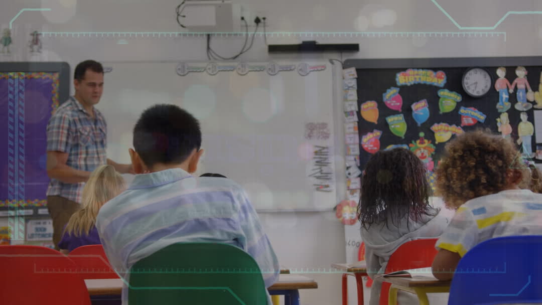 Students and teacher engage with digital interfaces in classroom, encompassing modern technology in education. Animation overlays suggest mutual interaction between screens and learners, enhancing educational experience. Suitable for highlighting digital learning techniques, tech-driven classroom environments or articles focusing on integration of technology in educational settings.
