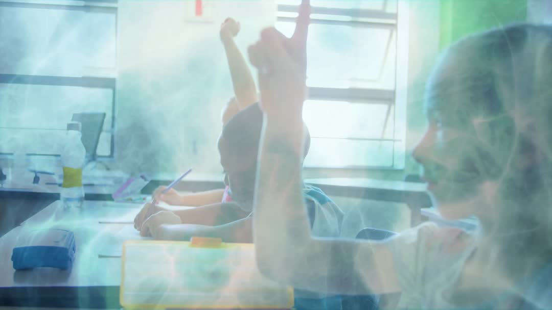 Active school students raising hands to ask questions in a classroom fostering curiosity and engagement. This could illustrate educational workshops, academic environments, and participatory learning methods. Suitable for educational materials, school programs, and teaching strategies promotions.