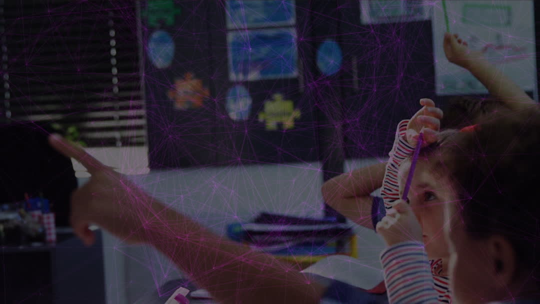 Image depicts pupils in a classroom actively participating with an overlay of digital network graphics. Represents integration of technology in education and learning engagement. Useful for illustrating modern teaching methods or educational technology advancements.