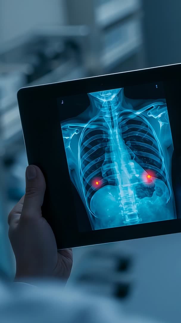- Clinician holding tablet showing moving chest X-ray with red lesion markers | Vertical medical video