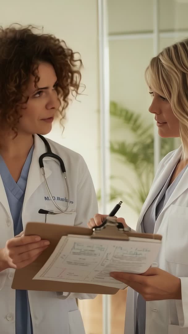 AI Generated Image. Vertical video showing two clinicians collaborating over patient chart while handing clipboard and clarifying notes. Close-up framing emphasizing professional interaction, stethoscope, and documentation workflow. Ideal for healthcare website hero banners, medical training modules, staff onboarding, patient communication videos, and social media campaigns promoting clinic professionalism and teamwork. Use for illustrating clinical handoff, chart review, interdisciplinary collaboration, and documentation best practices. Pair with voiceover, on-screen text, or branding graphics for practice marketing, training lessons, or internal communications.