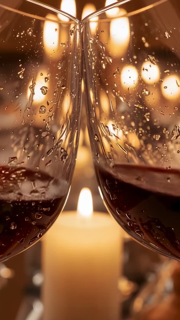 AI Generated Video. Closeup vertical video showing two red wine glasses clinking rim to rim in warm candlelight, droplets scattering across crystal, candle flames creating soft golden bokeh. Camera capturing condensation detail and liquid motion, creating cinematic intimate mood. Useful for romantic dinner promotions, wine bar advertising, restaurant hero reels, Valentine’s Day and anniversary campaigns, wedding toasts, lifestyle and luxury content. Ideal for short social media reels, background loops for menus, website headers, event invitations, commercial spots. Suggest slow-motion cut and warm color grading to enhance shimmer, or loopable edit for continuous ambiance.