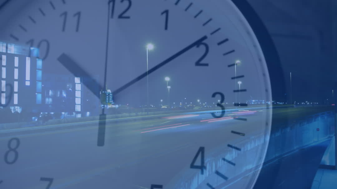 - Clock Overlay on Busy Night Cityscape Illustrating Time Management