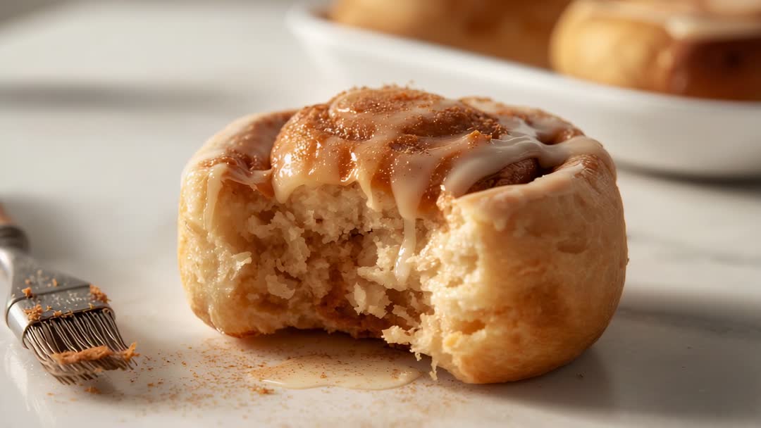AI Generated Image. Close-up video frame showing bitten glazed cinnamon roll with creamy icing pooling on marble countertop. Pastry brush with glaze crumbs lying nearby. Warm natural lighting highlighting soft flaky crumb and sticky glaze. Shot featuring shallow depth of field and studio-style food styling for appetizing texture and warmth. Perfect for bakery social media content, recipe tutorial clips, menu hero shot, cookbook motion still, product packaging, advertising banners, Instagram Reel thumbnail, or slow-motion bite loop. Use as insert clip for step-by-step baking videos, promotional spots for breakfast or brunch menus, or lifestyle content promoting homemade desserts. Color palette working well with warm beige and caramel themes and simple on-brand overlays for text or logo placement.