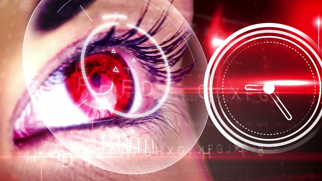 Close-up of a female eye overlaid with digital interface elements, indicating analysis and cyber security technologies. Red and white graphics, including rotating clock hands and digital characters, suggest advanced data processing. Ideal for conceptual and futuristic technology topics, illustrating themes related to cybersecurity, digital futures, and biometric scanning.