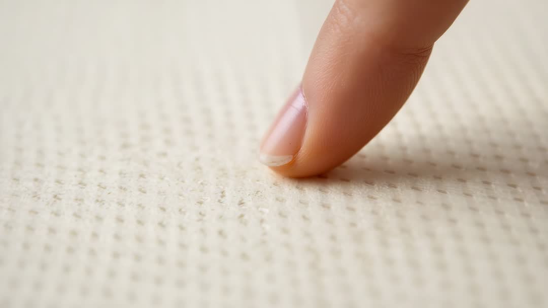 AI Generated Image. Showing fingertip pressing dotted off-white mattress cover to test texture and softness with shallow depth of field and ample copy space. Focusing on fingertip detail and fabric pattern to create intimate tactile moment for product demonstration or editorial usage. Featuring neutral palette and soft, diffused lighting to complement modern branding and UX layouts. Suggesting uses: mattress product demos, e-commerce hero clips, tactile feature highlights, quality control footage, sleep wellness editorial, review video, minimal background for typography overlays. Editing tips: using slow motion to emphasize compression, adding subtle ambient sound for tactile feel, applying warm color grade for cozy mood.