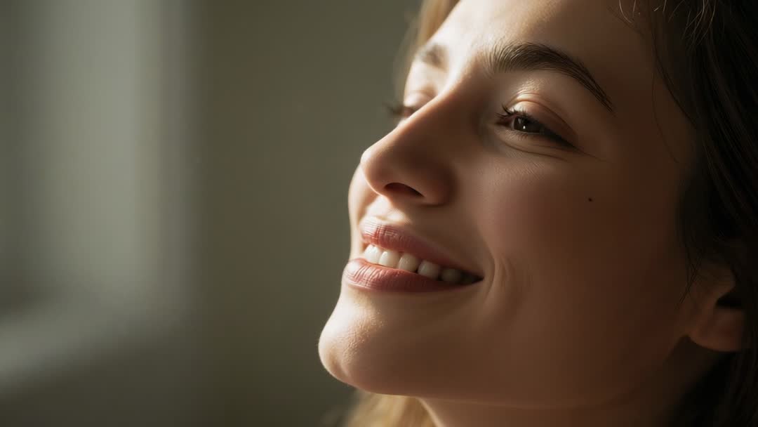 AI Generated Image. Close-up footage showing young woman smiling and blinking while soft window light gently caresses face. Mood feeling warm, intimate, and serene, showcasing natural skin texture, subtle smile lines, and gentle eye movement. Suiting beauty and skincare campaigns, supporting wellness and mental health content, enhancing lifestyle commercials, elevating social media reels and website hero banners, and complementing editorial spreads. Technical notes: working well with slow motion, soft color grading, shallow depth of field, and tight crop for emotional storytelling.
